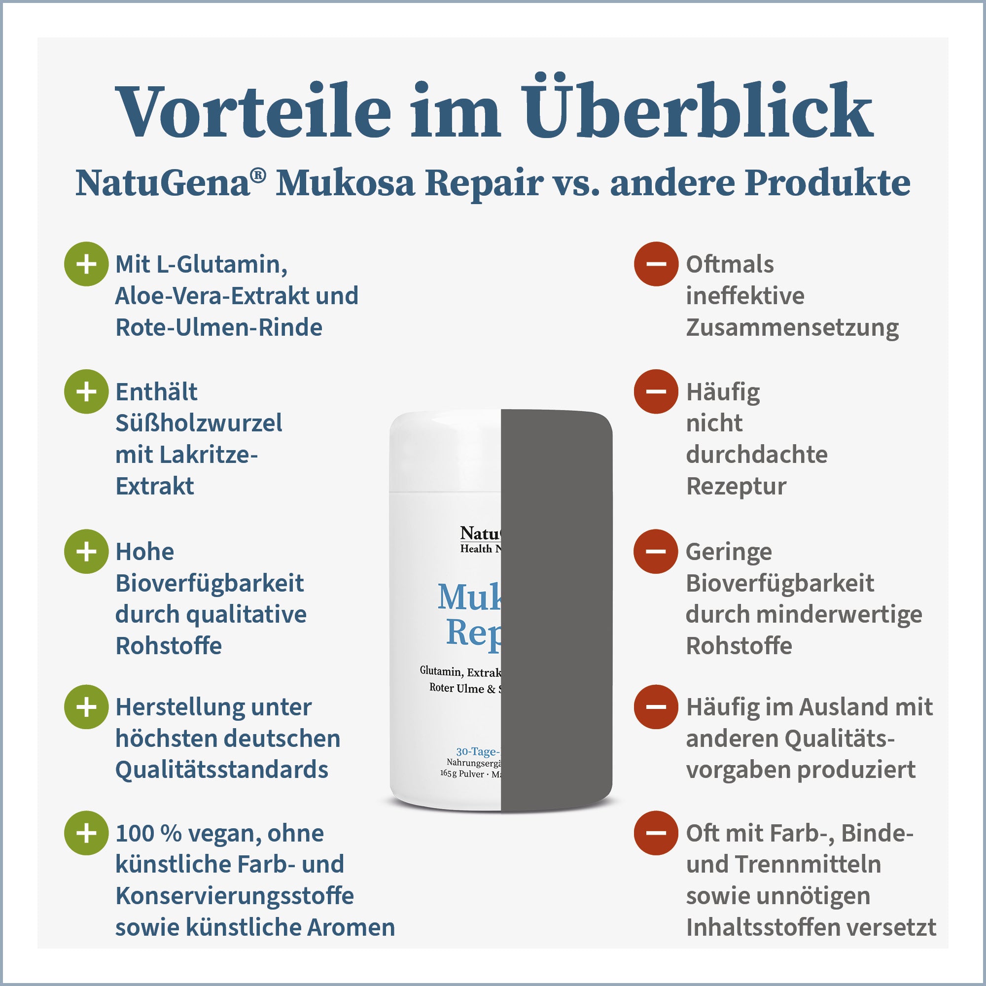 - MukosaRepair (Pulver) ist die gleiche Rezeptur wie gleichnamiges bei EPI-GENES, MukosaRepair Forte ist eine neue zusätzliche Rezeptur