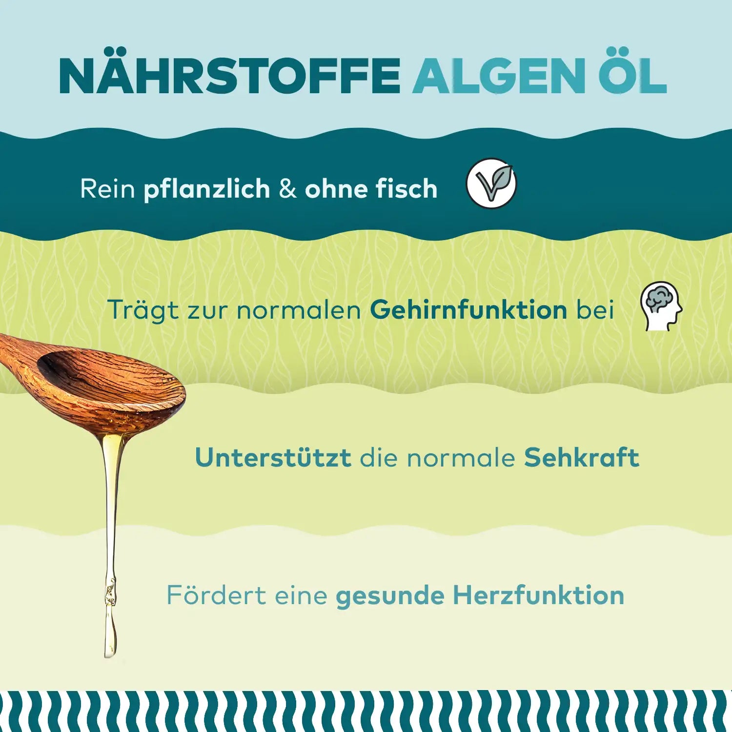 Algenöl ist die nachhaltige, vegane und schadstofffreie Alternative zu Fischöl. Es liefert die gleichen wertvollen Omega-3-Fettsäuren (DHA und EPA) – ganz ohne Belastung durch Schwermetalle oder Mikroplastik. Dank unserer frischen Herstellung bleibt das Öl frei von ranzigen Aromen und oxidierten Inhaltsstoffen, wie sie bei vielen Fischölkapseln auftreten können.